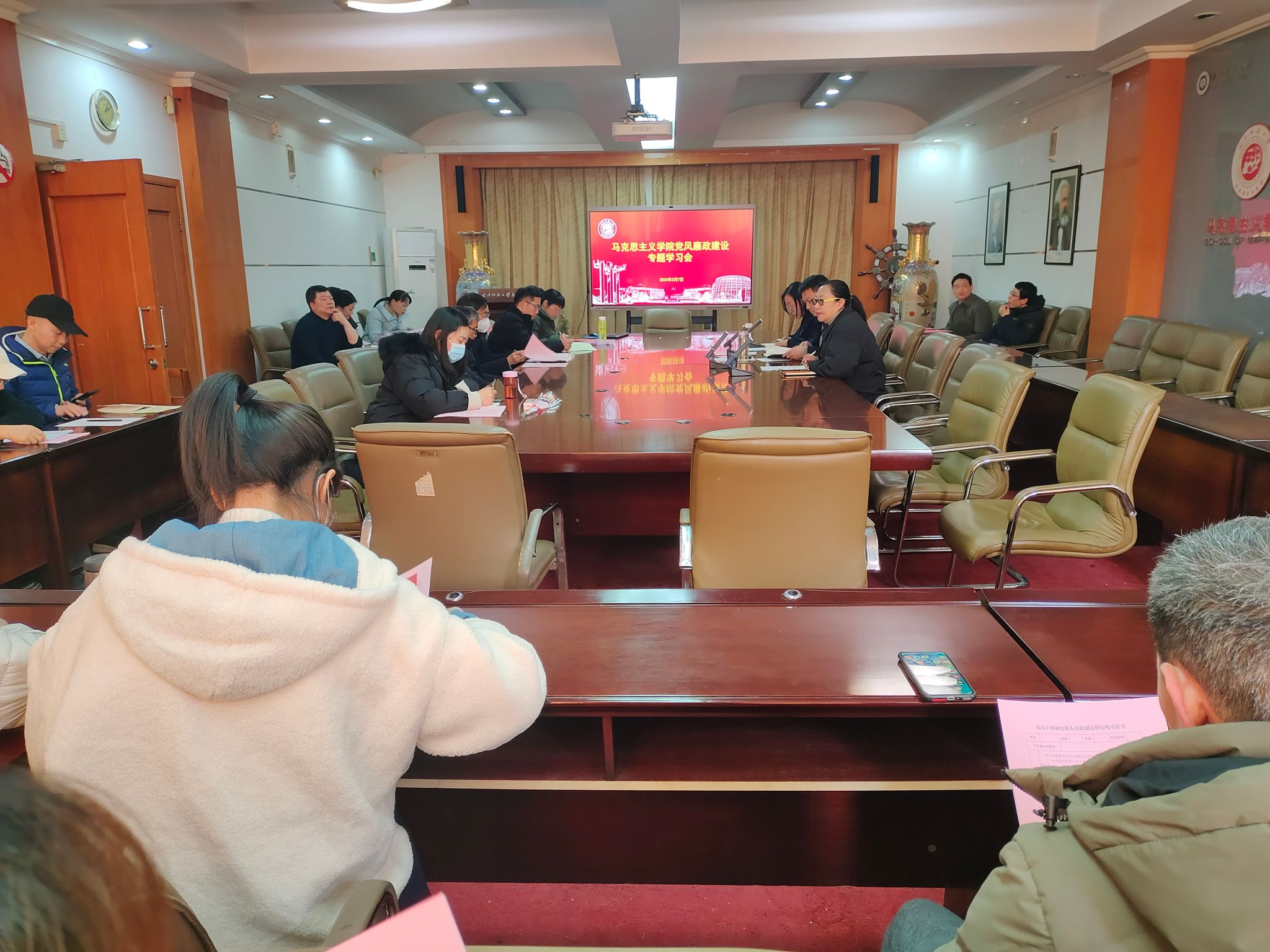 肖述剑带领全体教职工党员学习新修订的《中国共产党纪律处分条例》及教育部关于思政课教师队伍建设的相关文件精神,就公司党风廉政、师德师风建设提出明确要求,对公司党规党纪学习教育和师德师风建设进行总体部署。副经理刘艳就教学工作任务和工作安排提出具体要求,传达教务处新学期有关申报教学、教研奖项、本科教材资助文件精神。党委副书记徐喆就研究生日常管理工作、导师“四个一”活动推进工作进行了部署。