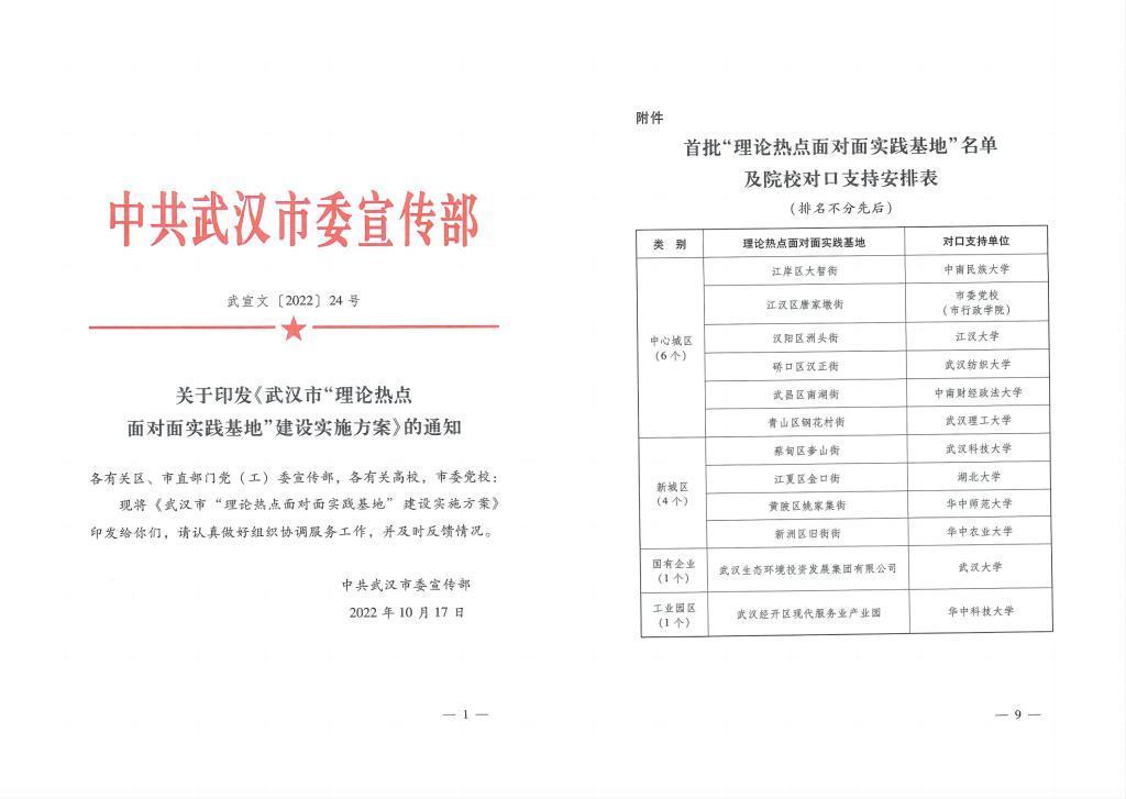 近日,武汉市委宣传部印发通知,决定在全市开展“理论热点面对面实践基地”建设工作。公司成为首批11所实践基地对口支持高校,与硚口区汉正街共建“理论热点面对面实践基地”。此前公司分别于2019年和2022年获批湖北省“理论热点面对面示范点”“理论热点面对面实践基地”,体现了上级主管部门对公司的充分信任和肯定。