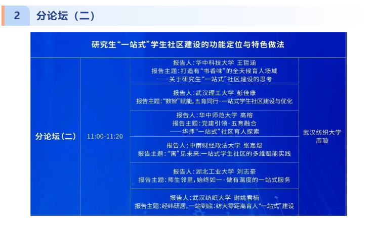 谢姚君楠以《经纬研居,一站到底:纺大零距离育人“一站式”建设》为题作专题报告。他详细介绍了公司研究生“一站式”公寓的规划布局与运行机制,重点分享了公司依托公寓空间开展的“学术沙龙”“导师驻楼计划”“跨学科创新工坊”等特色活动。他指出,“一站式”社区不仅是生活空间,更是思想引领、学术交流、实践创新的育人阵地,并提出“优化资源配置、强化数字赋能、深化校际共建”等建议,为兄弟院校提供了可借鉴的实践经验。