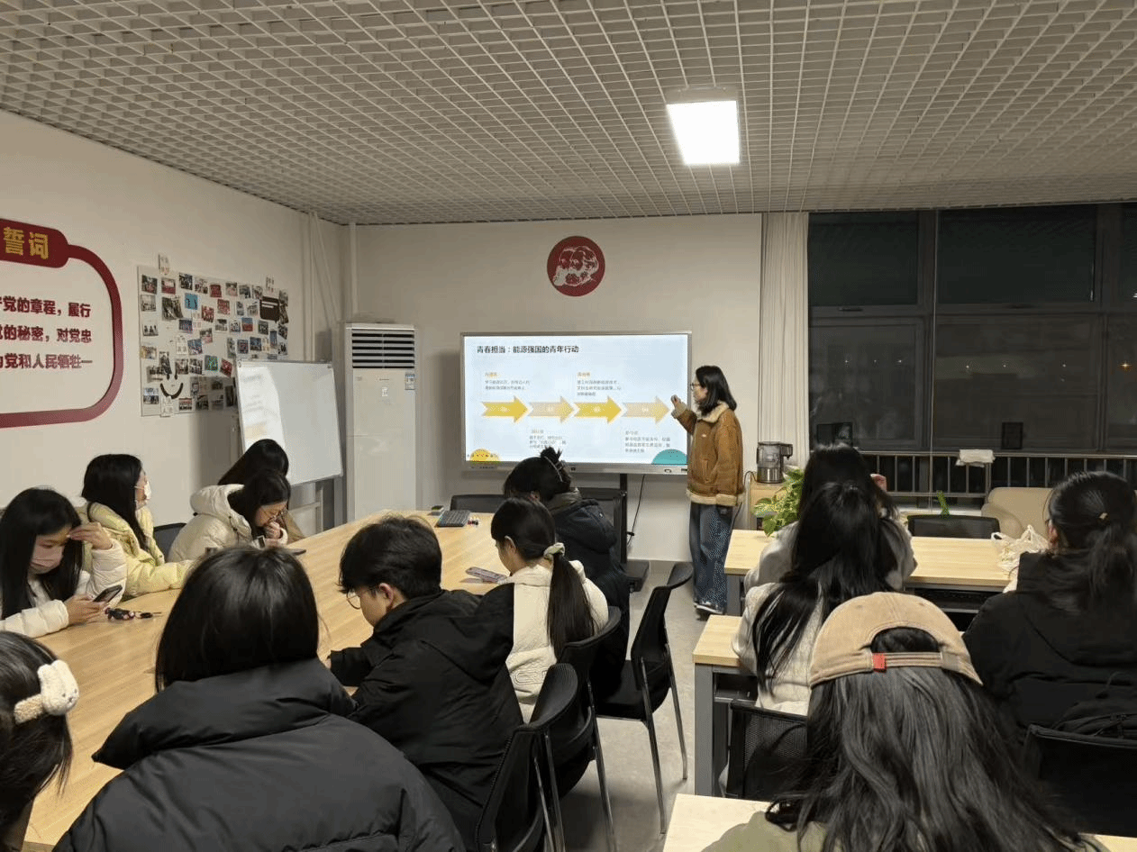 本次团课在全体团员的激昂歌声中正式开始。薛珊同学以“青春赋能能源安全,共筑强国发展根基”为主题,围绕“加强能源产供储销体系建设”进行了系统阐述。她首先指出,能源保障和安全是事关国计民生的“国之大者”,并结合日常生活与国民经济运行实例,强调了能源供应的重要性。在讲解中,薛珊同学系统分析了我国能源安全面临的三大挑战:需求持续增长、清洁能源供给存在间歇性短板以及国际地缘政治带来的风险。随后,她通过详细数据展示了我国在能源保供与发展方面取得的显著成就,进一步总结了能源强国的“中国智慧”,即坚持增强供给能力根本、坚定绿色转型方向、强化全国统筹协调。最后,她向全体团员发出号召,鼓励大家争做能源知识的“传播者”、技术政策的“追光者”、节能志愿的“参与者”、低碳生活的“践行者”,将个人理想融入国家能源事业,用青春行动筑牢国家能源安全防线。
