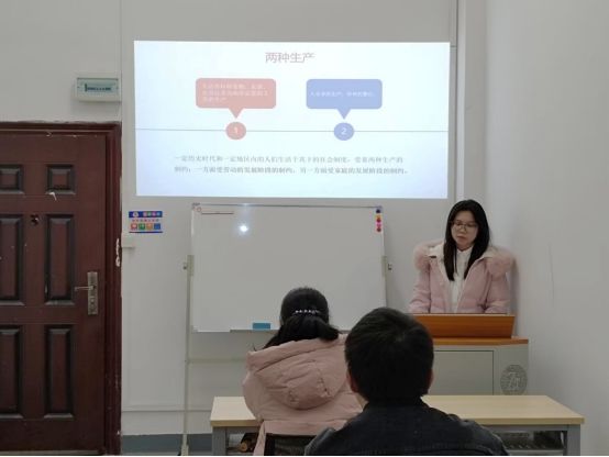 胡姗针对《家庭、私有制和国家的起源》一书,向大家作了读书汇报。她从写作背景入手,对该书写作的历史背景和思想渊源进行探究,随后从两种生产、家庭的起源和发展过程、私有制和阶级的产生、国家的起源和本质等四个方面对该书做了解读与分析,并分享了对于新时代女性的相关感悟。