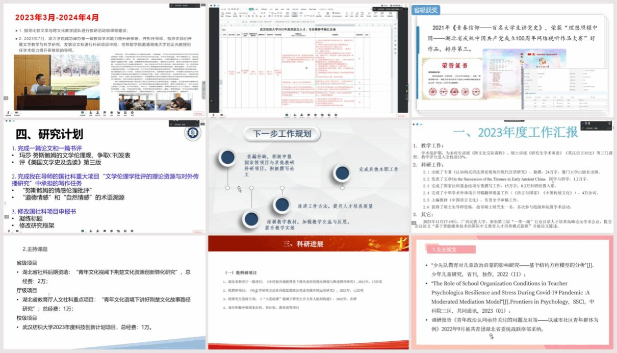 beats365官方网站阳光讲席教授项久雨和外国语公司阳光讲席教授季水河分别委托团队成员常沛和刘方荣做报告发言,介绍了近3年指导公司马克思主义理论学科、外语学科在人才培养、团队建设方面所做的工作和取得的成果。beats365官方网站阳光特聘教授金艳、王海燕展示了在教学质量提升、科研成果产出和社会服务等方面的突出成绩。张守慧、李少多、陈春兰等12名参加2023年度考核的博士专任教师对照合同任务,逐一报告了任务完成情况。