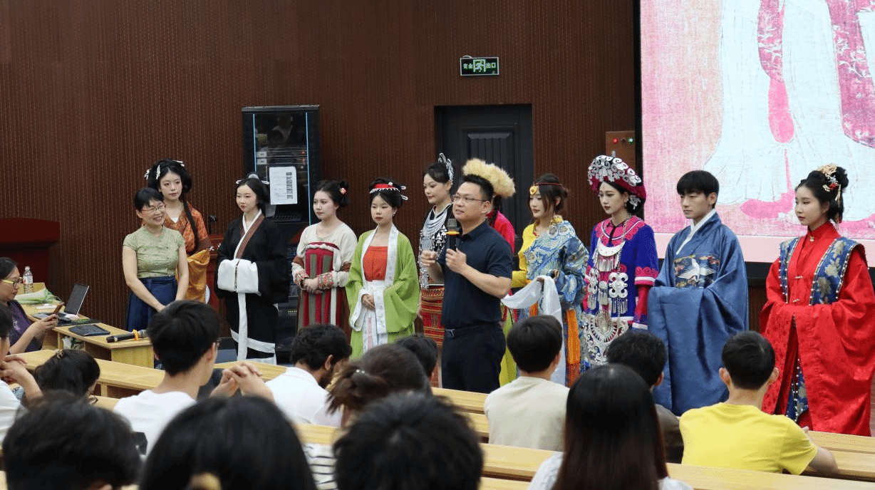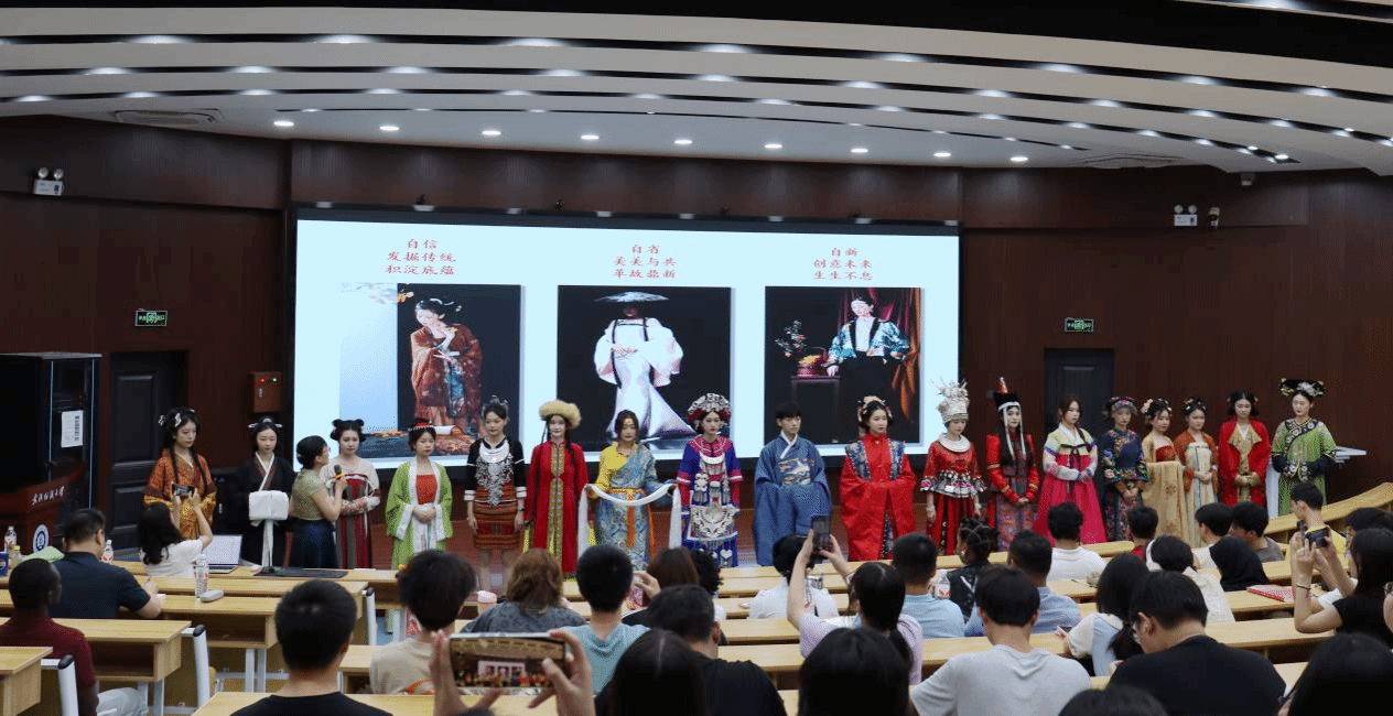 授课各阶段均进行穿插式的现场教学演示,由表演嘉宾倾情演示传统服装和民族服饰之美。丰富多彩的现场演示,使大家更深入地领略了中华服饰的魅力。最后,陶辉对青年学子提出了着装建议,强调日常着装是个人品位和修养的体现。她鼓励新时代青年学习传统服饰文化,提升自身审美素养和能力,并将其作为终身学习的能力。陶经理用“三自”总结了课程内容:“自信”——发掘传统,积淀底蕴;“自省”——美美与共,革故鼎新;“自新”——创意未来,生生不息。