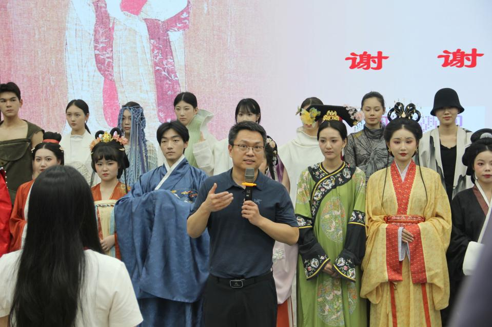 为增强现场体验感,服装公司研究生身着按史料复原的周制深衣、唐制齐胸襦裙、明制马面裙等经典形制服饰,进行立体动态展示。随后,服装表演专业的员工带来一场“传统与现代的对话”主题走秀,借由面料混搭、结构重构,直观演绎传统服饰文化与现代设计理念的碰撞交融。陶辉结合每件服饰的纹样寓意、剪裁工艺,深入阐释了“自信—自省—自新”的文化逻辑:挖掘传统服饰底蕴筑牢自信根基,以开放视野推动多元融合与变革作为自省方向,借创意设计让传统服饰文化在当代焕发生机,实现文化自信。