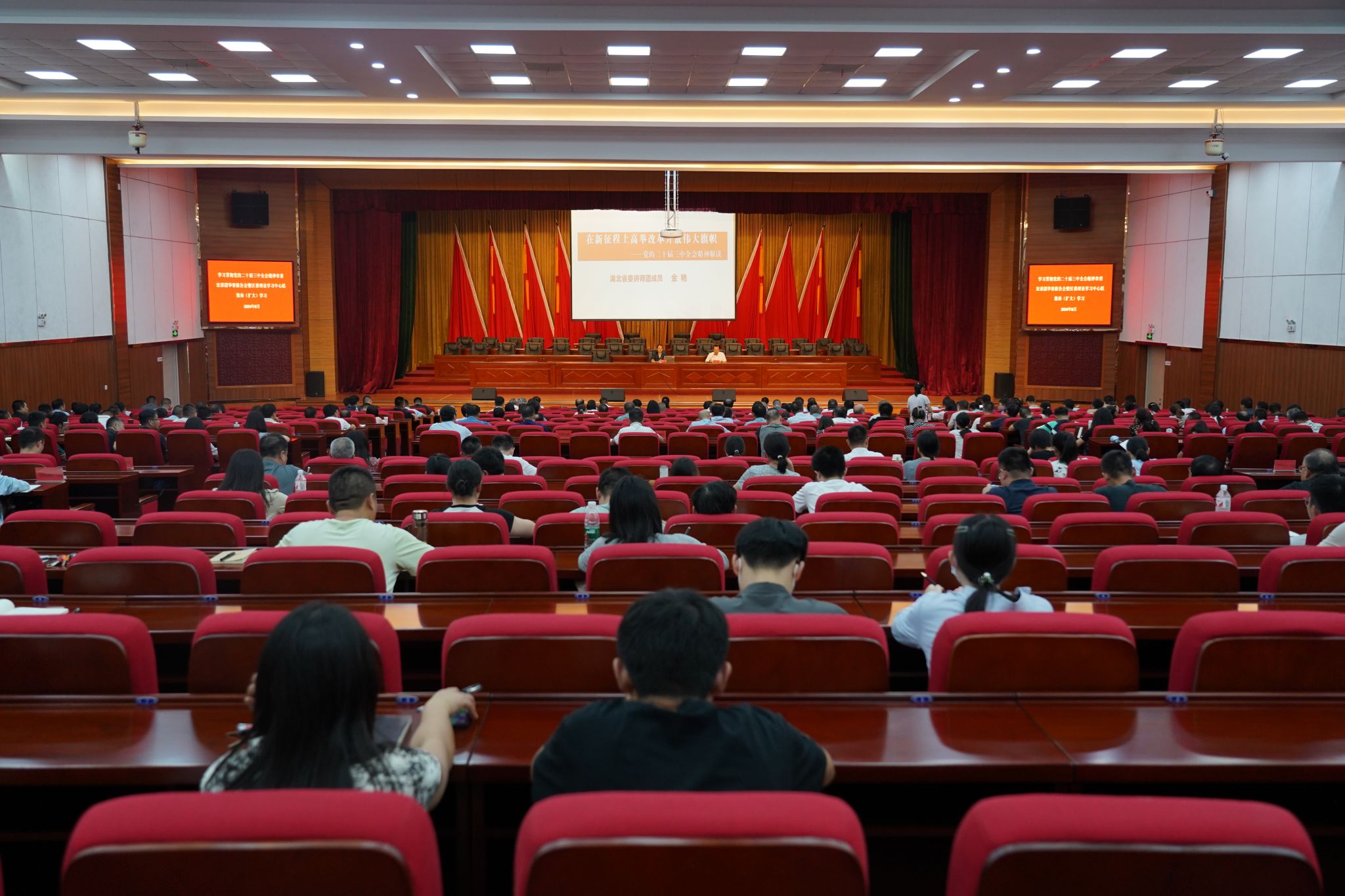 8月23日,学习贯彻党的二十届三中全会精神市委宣讲团华容报告会暨区委理论学习中心组集体(扩大)学习会议举行,省委宣讲团成员、beats365党委常委、组织部长金艳作示范宣讲报告。市委宣传部常务副部长刘荣出席,区委副书记、区长龚骏主持报告会。