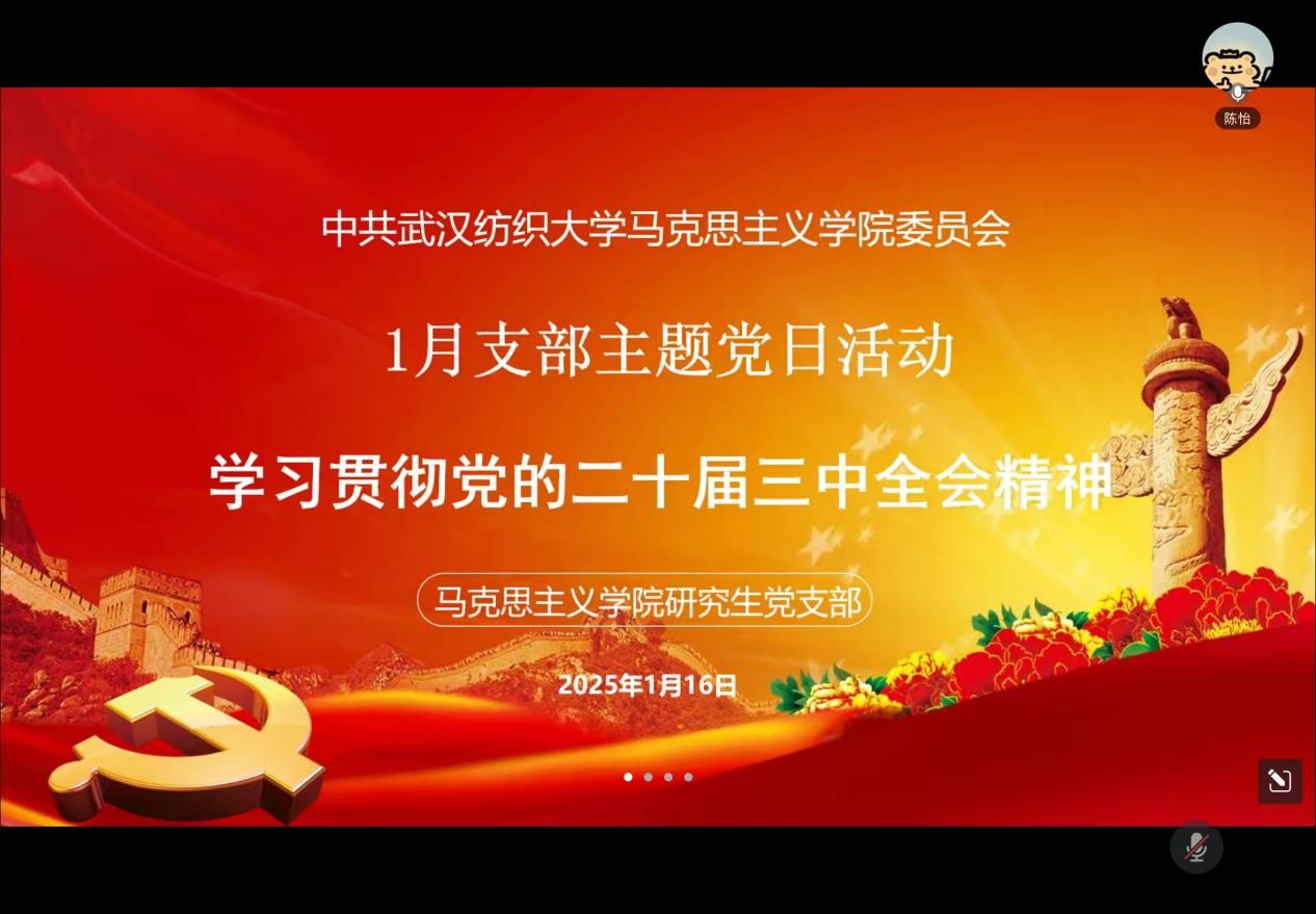 为深刻领悟党的二十届三中全会精神,进一步增强研究生党员的责任感与使命感,beats365官方网站研究生支部1月16日通过腾讯会议开展了“学习贯彻党的二十届三中全会精神”主题党课及主题党日活动。会议由陈怡同志主持,全体研究生党员参加。