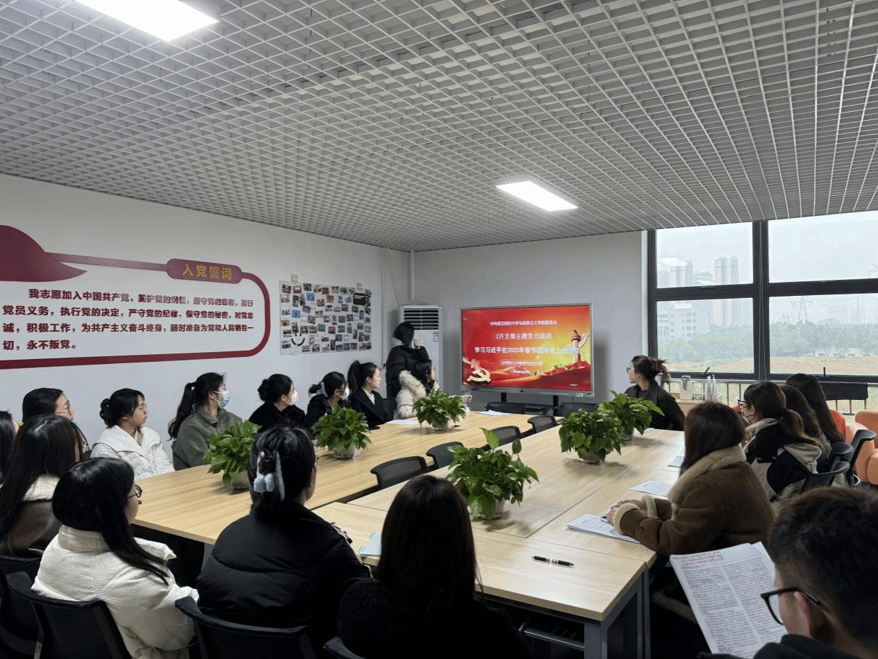 在2月主题党日阶段,蒋佳美同志带领全体党员共同学习习近平在二〇二五年春节团拜会上的讲话。蒋佳美同志强调,在学习和生活中,我们要以拼搏奋斗的精神,积极投身科技创新和实践,为高质量发展贡献力量。面对困难,要坚定信念,勇于直面矛盾,敢于迎接挑战,以实际行动践行党的宗旨,为强国建设和民族复兴贡献青春力量。
