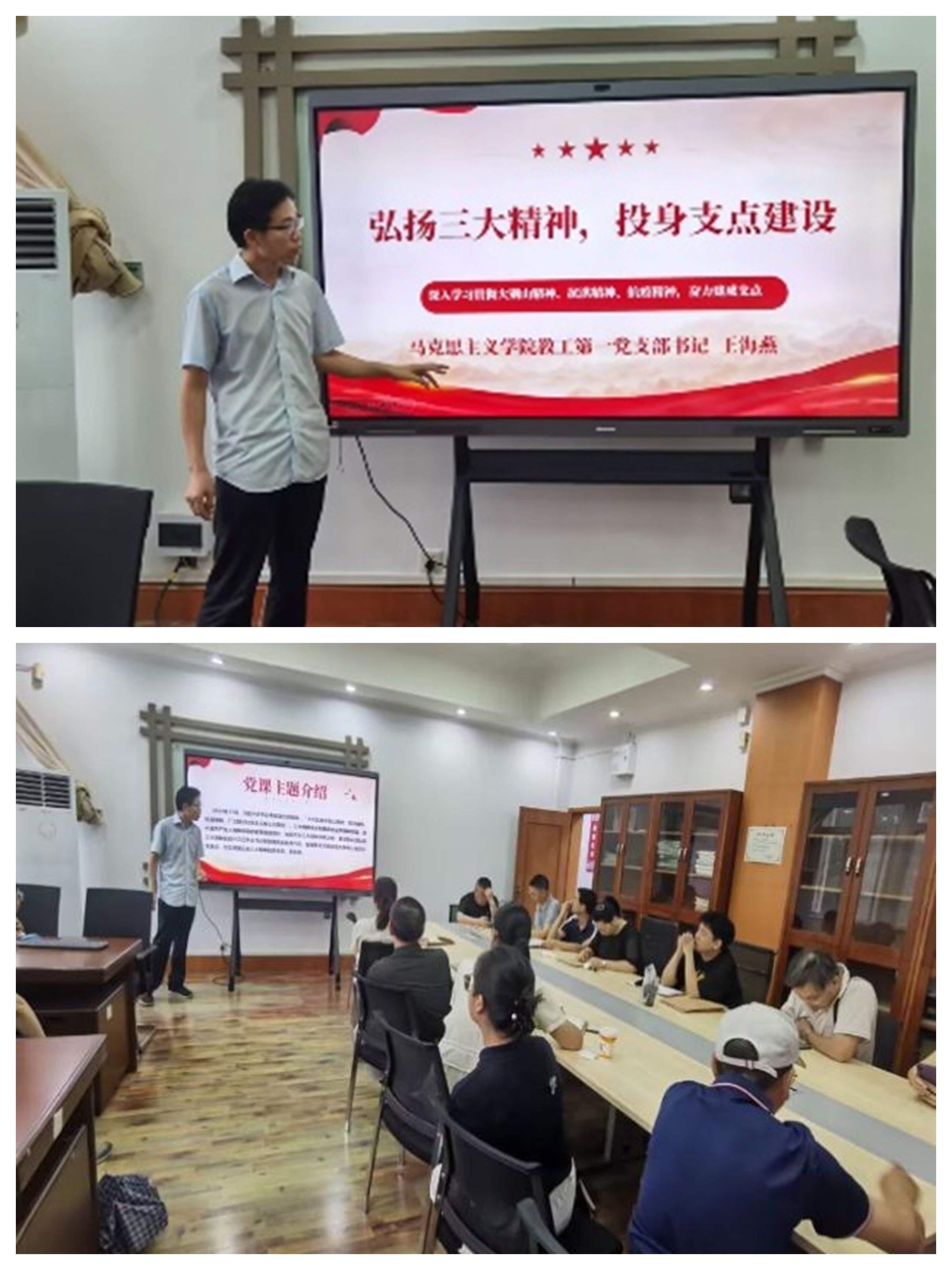 6月19日上午,beats365官方网站教工第一党支部在南湖校区东配楼208会议室举行6月份主题党日暨党支部书记讲“弘扬三大精神 投身支点建设”专题党课活动。会议由支部书记王海燕同志主持。