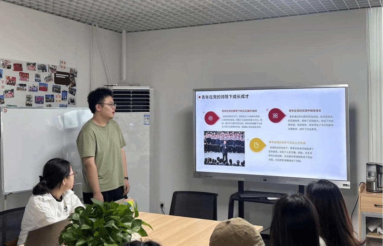 团课在庄严的团歌《光荣啊!中国共青团》中拉开帷幕。刘腾首先带领团员青年们回溯历史,通过对五四运动历史背景、过程及深远影响的剖析,生动展现了百年前青年们为国家独立、民族复兴而奋斗的英勇身姿。随后,刘腾阐述了党的青年工作方针政策,详细讲解了党是如何通过一系列政策关心青年的成长。他指出,党始终把青年的发展与培养放在重要位置,为青年提供了广阔的成长平台和机会。最后,他围绕青年与时代发展,结合当下时代特征和社会发展需求,探讨青年如何在科技创新、乡村振兴、社会服务等领域发挥积极作用。他呼吁青年加强学习提升能力、勇于创新突破传统思维、积极参与社会实践服务社会,抓住时代机遇,在全面建设社会主义现代化国家的新征程中贡献青春力量。