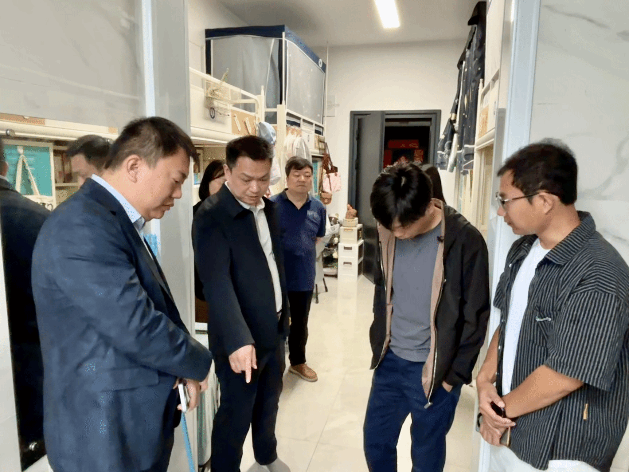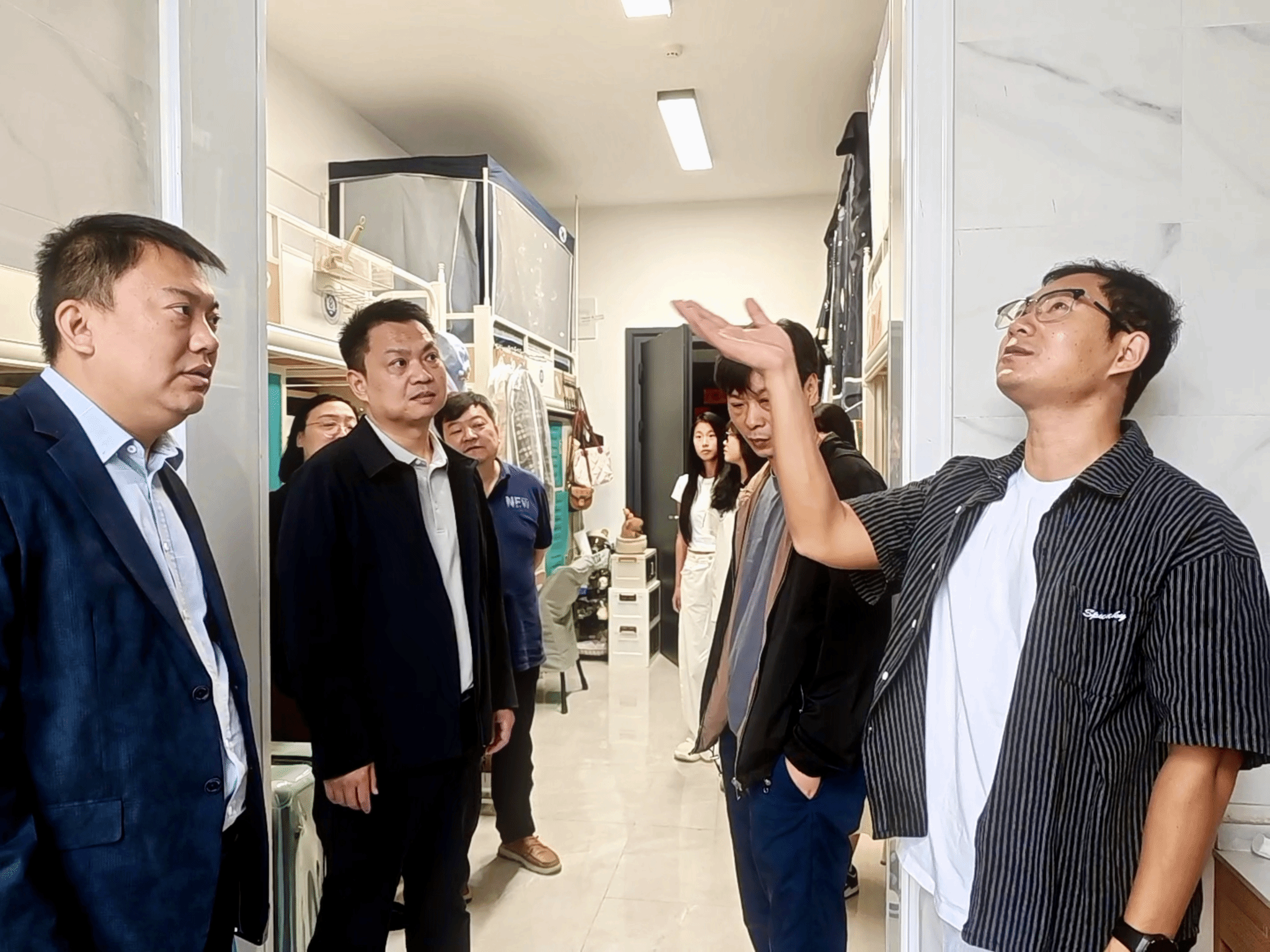 肖述剑还深入员工宿舍,关注员工日常生活与学习状态,仔细询问住宿条件、用电安全及自习空间需求,并现场协调解决研究生反映的15栋A502宿舍卫生间顶部漏水问题,与基建处积极联动,深入沟通、分析成因、共同商讨切实可行的维修方案,力求尽快彻底解决这一影响员工生活的“烦心事”。
