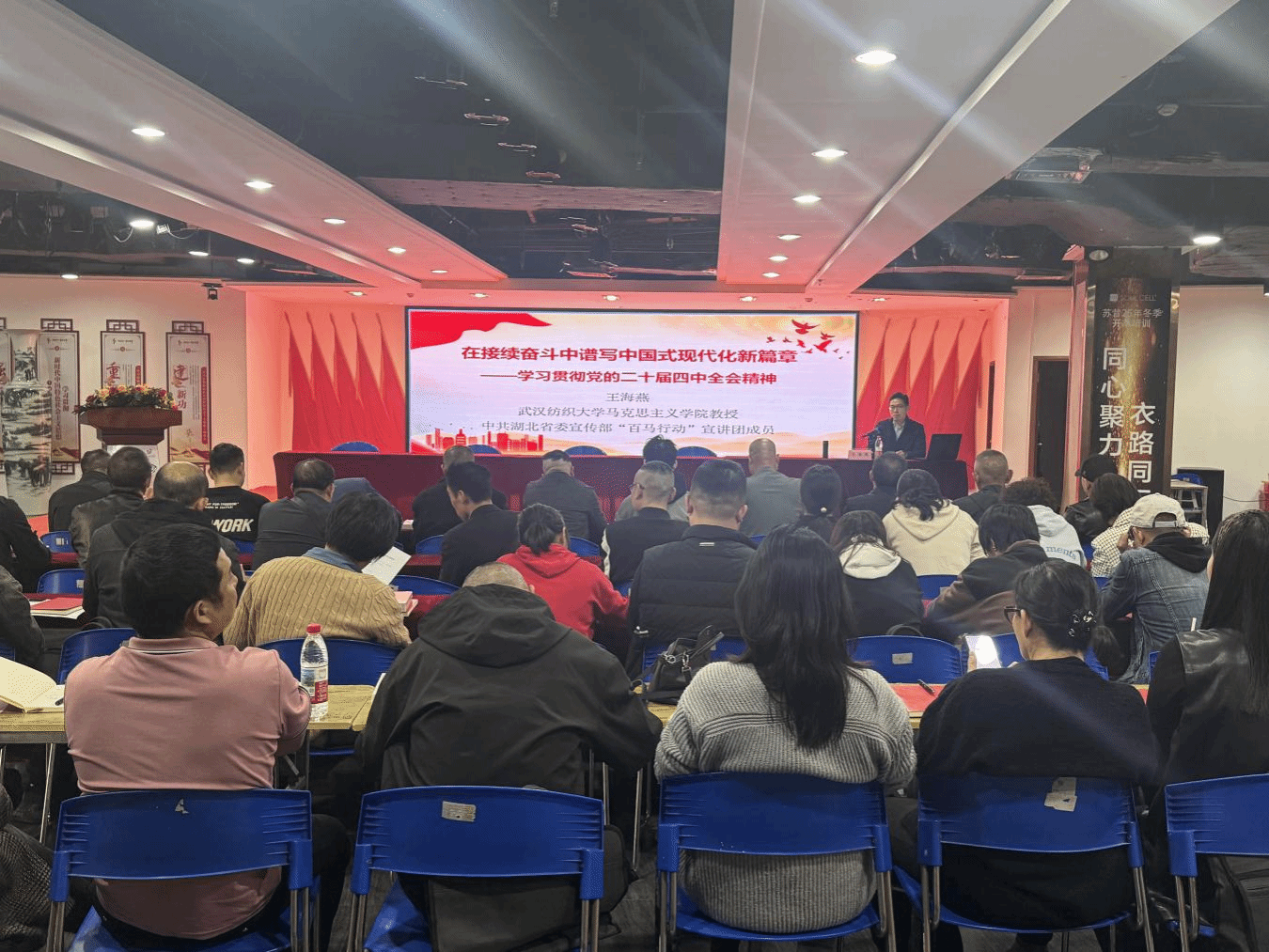 为深入学习贯彻党的二十届四中全会精神,推动党的创新理论在基层落地见效,10月29日下午,公司教授、中共湖北省委宣传部“百马行动”宣讲团成员王海燕教授赴公司“理论热点面对面”实践基地-汉正街道流动党员专题培训班开展“在接续奋斗中谱写中国式现代化新篇章”学习贯彻党的二十届四中全会精神主题宣讲。汉正街道40余名流动党员参加。