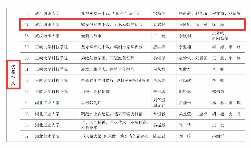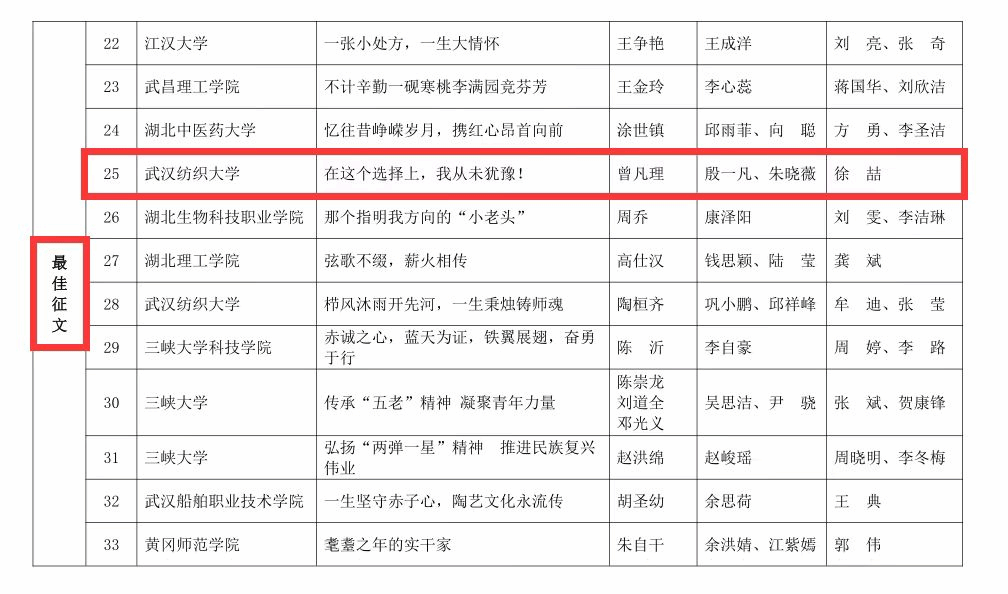 2023年12月20日,由湖北省教育厅关心下一代工作委员会主办的2023年全省“读懂中国-老少共话二十大,踔厉奋发新征程”活动评审结果揭晓,公司学子在活动中喜获佳绩。由公司2022级硕士研究生殷一凡、朱晓薇撰写的《在这个选择上,我从未犹豫!》获湖北省最佳征文奖,由2022级硕士研究生张博影、徐冕撰写的《鹤发银丝志不改,无私奉献守初心》获湖北省优秀征文奖。
